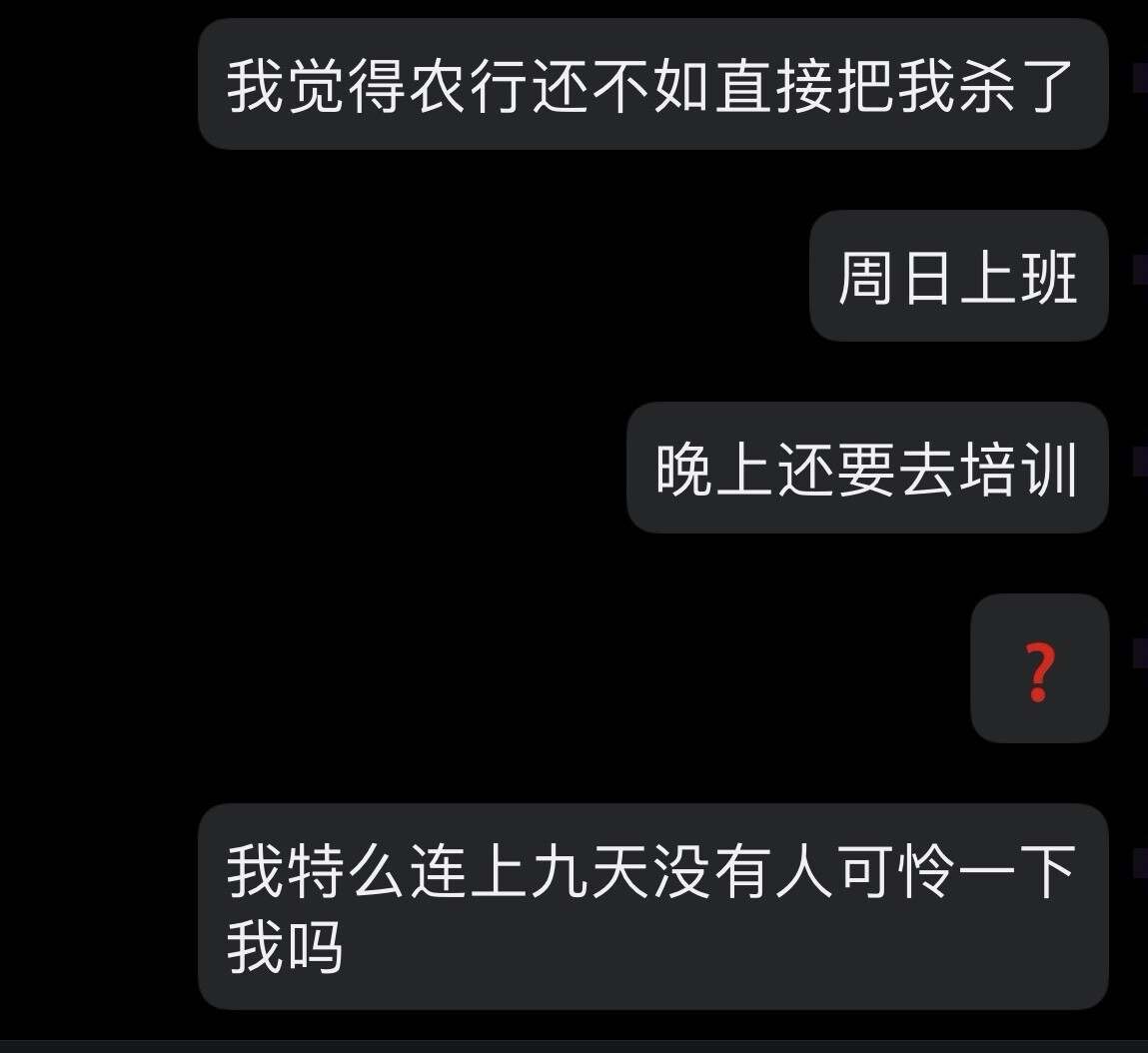 一想到春节前我连上9天我就特么想把农行领导全捅死