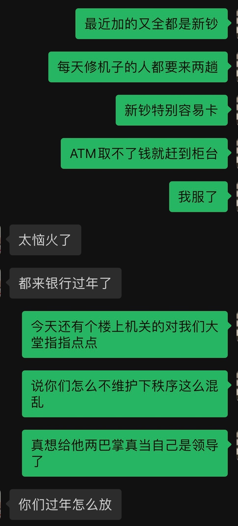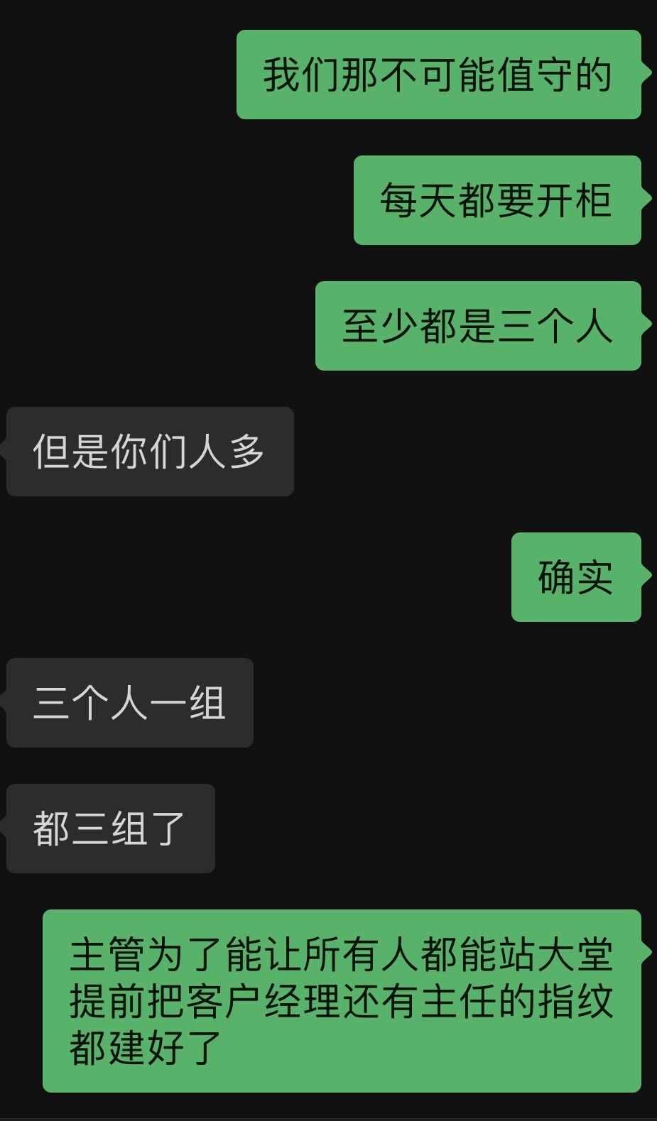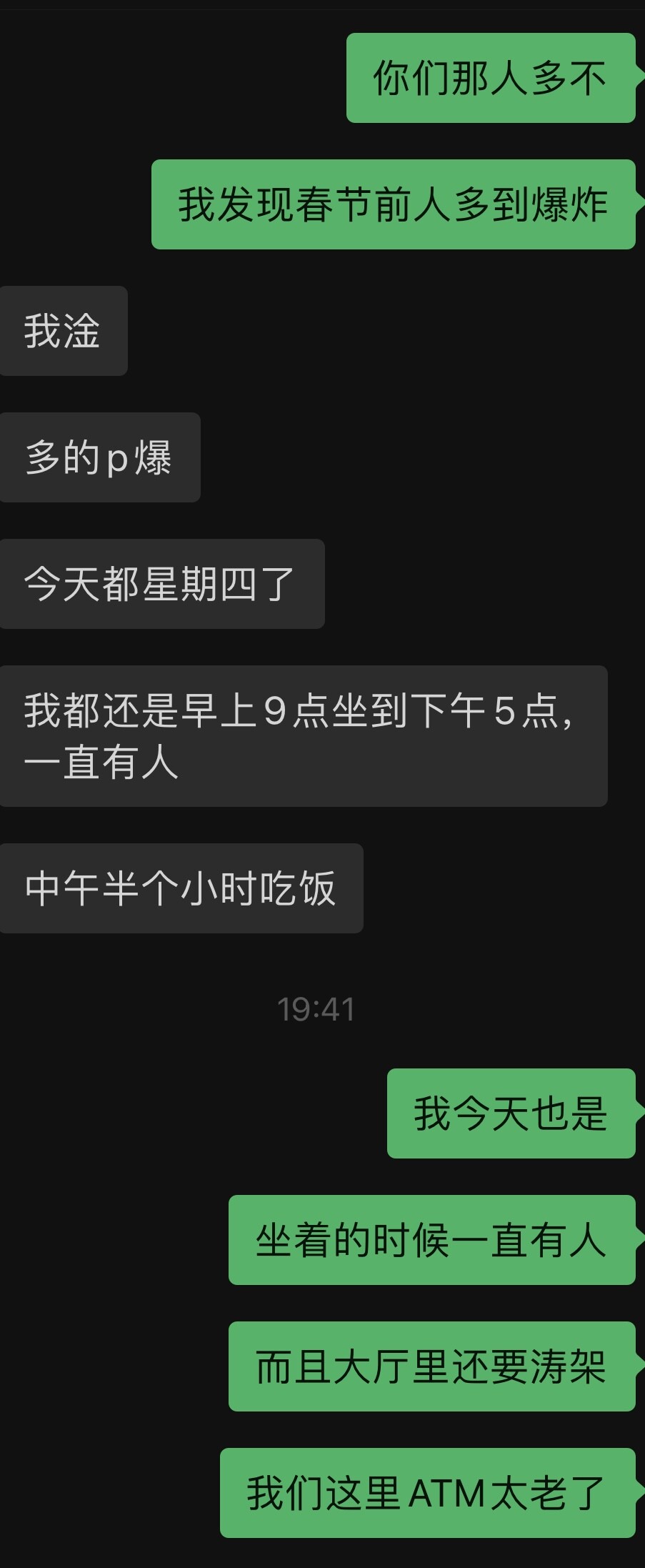 今天七点半才下班,原因是贷款放贷我必须当经办人,资料等到7点才拿来,等省分行授权的时候看到排队人数12惊了,死了吧这群人都。然后那个领导居然还等到我和主管要走了才一起走还在二楼转来转去,这就是银行jpg