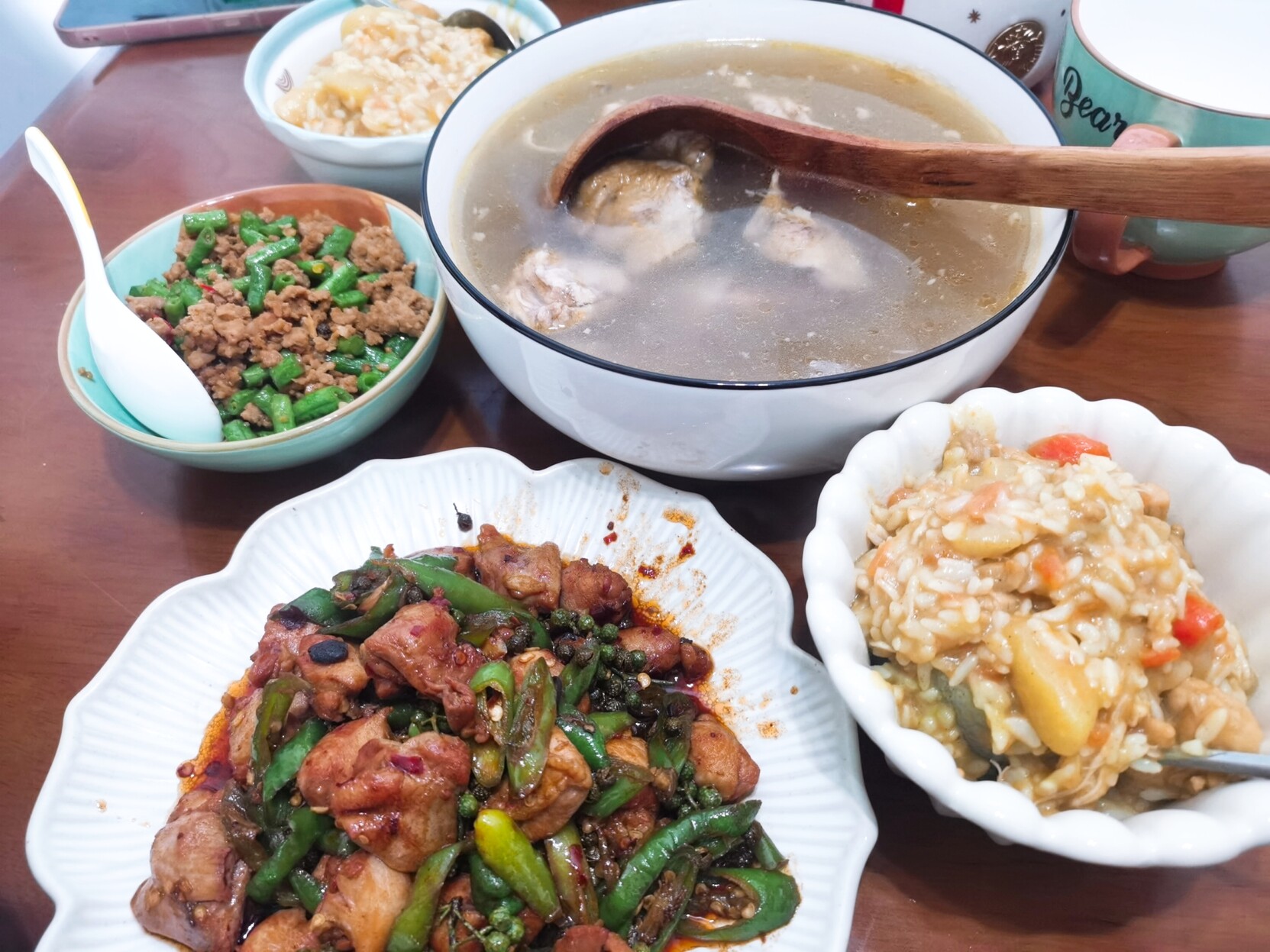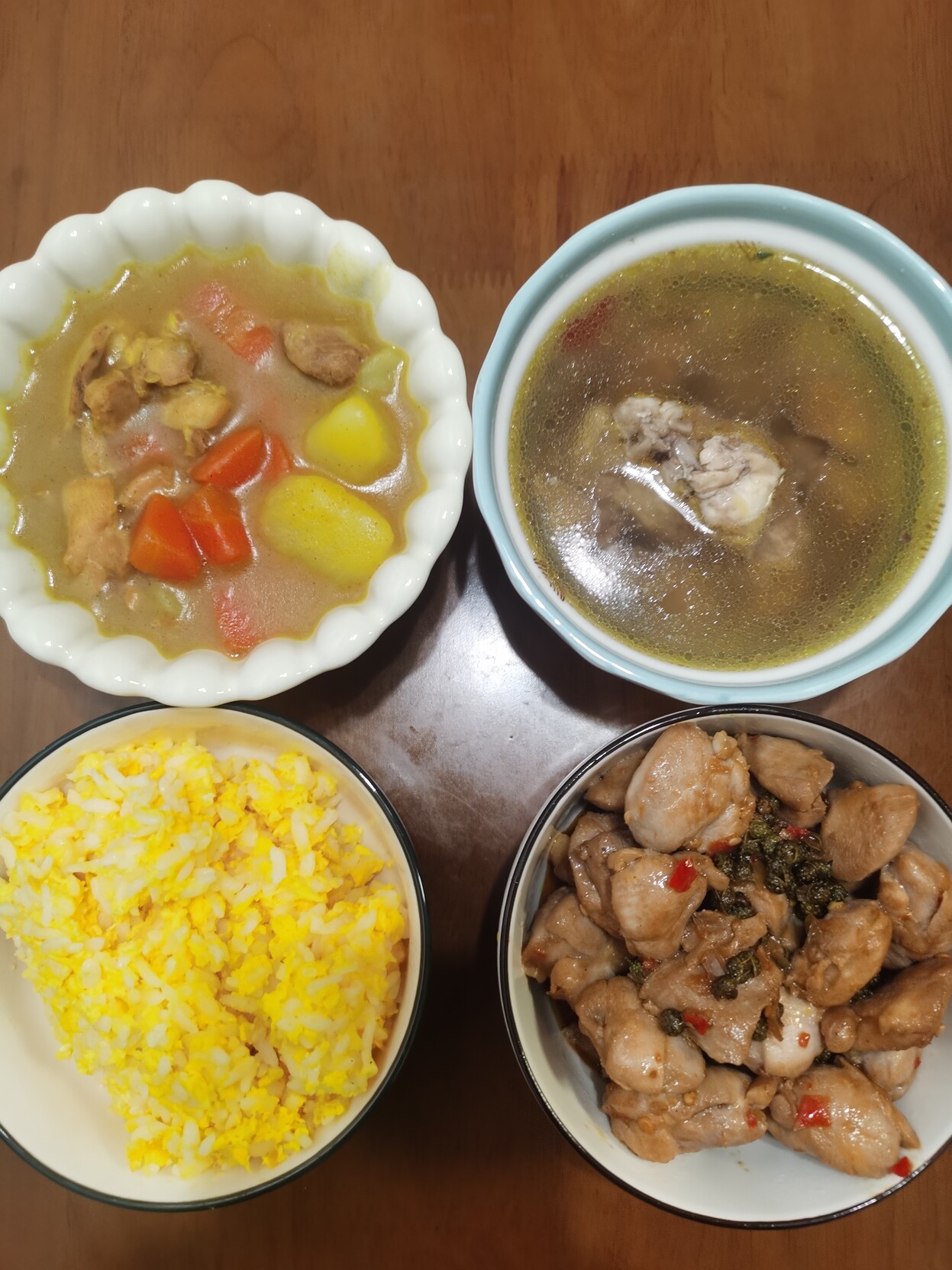 晚饭:咖喱、花椒鸡丁、板栗鸡汤、蛋炒饭