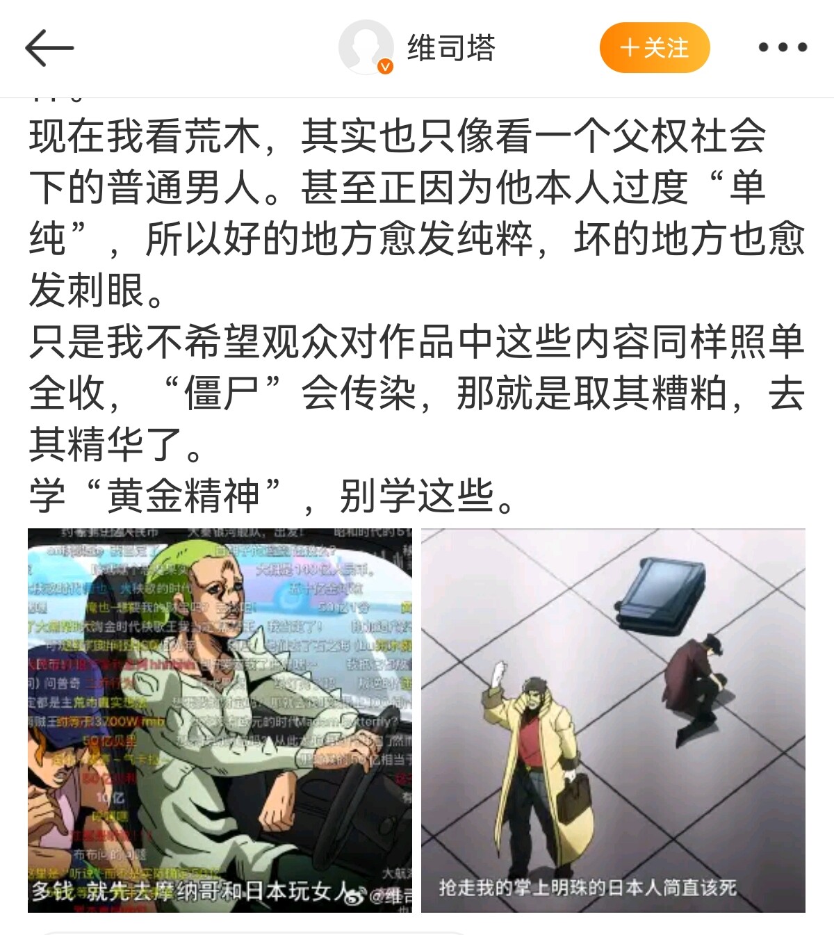 看一些女网民批判流行作品的男作者的性别意识颇有买椟还珠之感,很多男作者对女性的意识甚至不算一个椟,只是椟的一个镶边料。我觉得荒木是个热爱暴力的人,热爱暴力的作者会在可以用上暴力的时候践踏一切抓到手的东西,jo作为好看的战斗番也是因为作者对暴力的想象很丰富,这时候挑那种看亲妈洗澡队友偷看女性的胸这种刺太像小打小闹。对荒木的观感跟博主一样,他对其它性别没有特别恶意,只是单纯地输出了自己的主观理解和认知中的东西。而有的男作者简直incel仇女味溢出。
