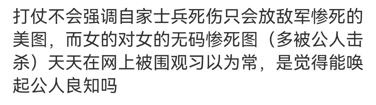 大多数女的真就是这么想的,“试图唤醒公人的良知”。女性因为长期失权喜欢把道德资本当作生存资本来竞争,即把道德当作权力的代餐,运行逻辑大致是因为我有道德所以我不能被打、因为我有道德所以我可以把巴掌挥向牌坊立得没我多的人等等。“我有道德”就是她们沉迷的权力代餐叙事。越是沉迷这套叙事的人,越是需要一些下场惨烈的完美受害者让自己站上道德高地。喜欢在sns上热转被家暴到鼻青脸肿的女性离婚照、被家暴致死受害女性的信息、甚至一年前家属发出维权的受伤细节图都要拉出来翻炒的人,不是想为受害者发声,是想用受害者替她们发声。但公人是真正的power animal,妳猜他们看见了会啥反应,嘿嘿都被打得这么惨了们女的不愧是垃圾。谁是和真虐女者配对的真虐女爱好者我暂且蒙在鼓里。