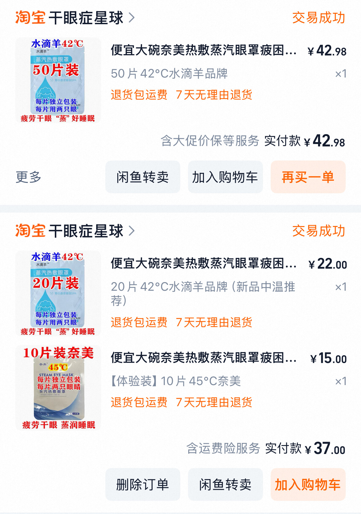 给旁友们推荐这家店的蒸汽眼罩,比花王什么的便宜多了,均价一块多一片,还有温度可选。个人比较偏好42°C的,45°C对我来说稍微有点热了