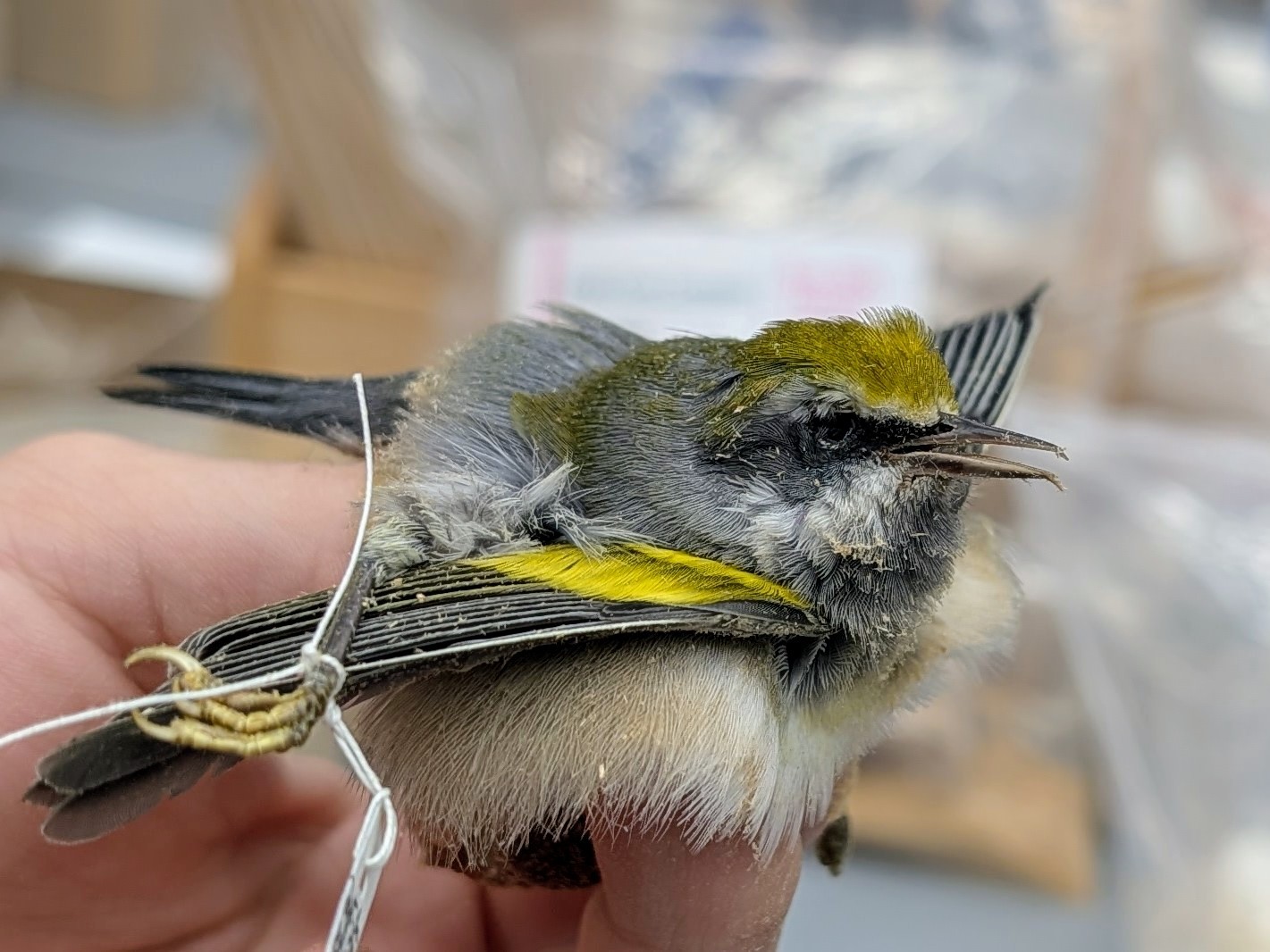在博物館亂晃,看到有志願者在做皮毛標本。湊過去打了招呼,佢拿起已經剝離軀體的金翅蟲森鶯(Vermivora chrysoptera)皮囊指給我看:喙尖端彎折的部分是撞擊玻璃導致的。