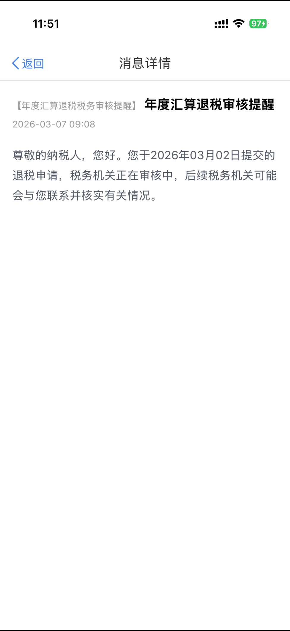 今天退稅倒是有動靜了 收到這個提示信息 看起來是機審不過轉人工了 估計更慢了 看往年要等十多天🥲