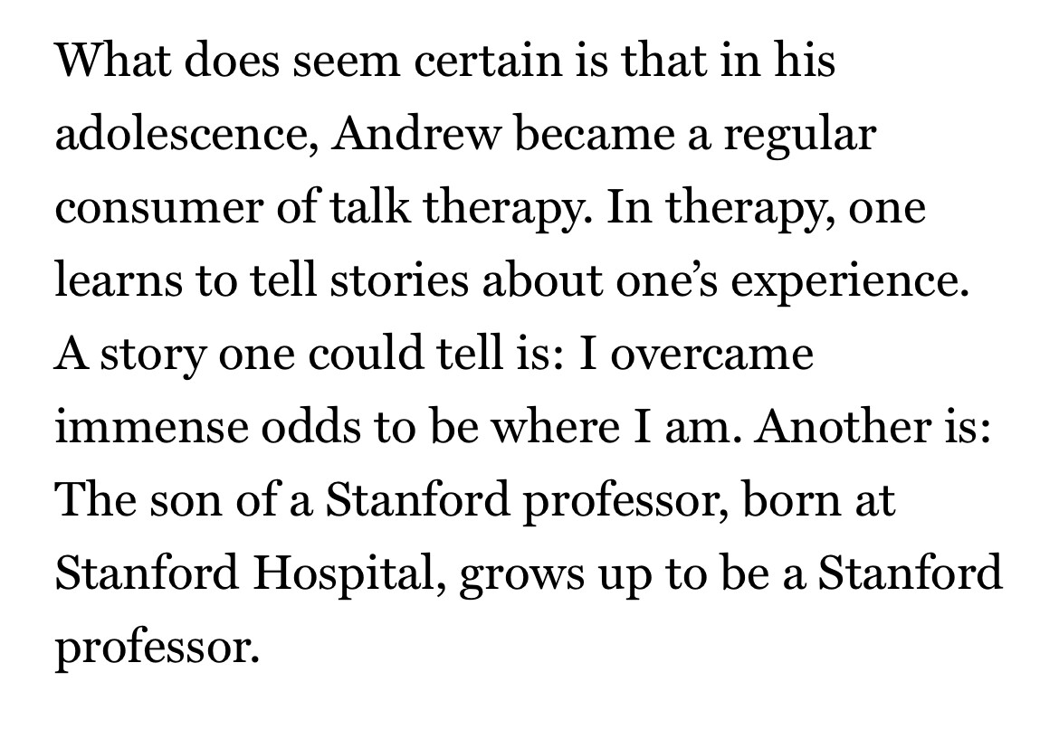 每个人都喜欢听故事,也喜欢讲故事,这就是为什么去心理咨询人总会控制不住撒谎(我有个凄惨的童年、你上周让我做的事我都做了etc)。既然父母离婚了就说成你从小被忽视而且他们还把你送进detention center最后你通过自己努力成为了斯坦福教授,千万不要说你爸就是个斯坦福教授而且没这事儿。therapy就是讲故事去的,讲的人内心的表演型人格越来越高兴故事越讲越顺,和面试是一样的。